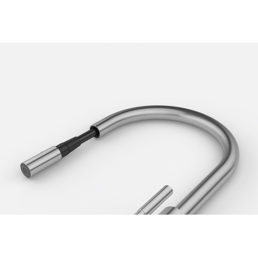Mythos Masterpiece J con caño extraíble, acabado en antracita PVD, altura total de 466mm. Presenta un elegante patrón estriado en el cuerpo del grifo y está diseñado para complementar la exclusiva gama de fregaderos Mythos Masterpiece.