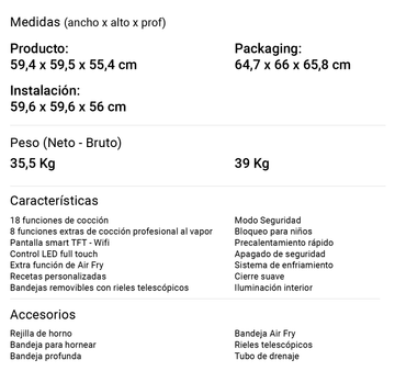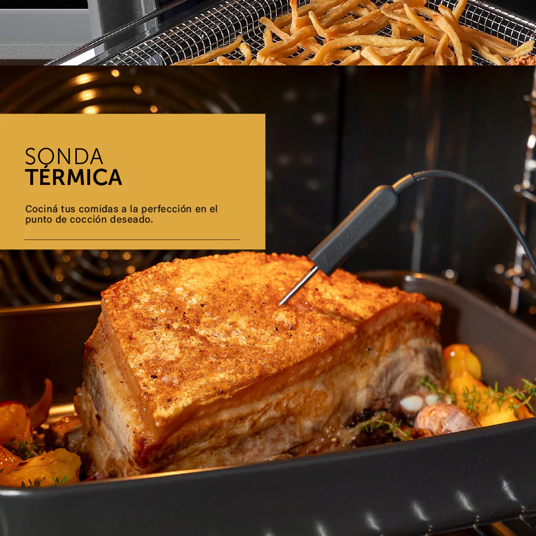 Con 81 Litros de Capacidad y 18 Funciones de Cocción , incluido Air Fry, este horno es ideal para preparar comidas abundantes y crujientes con menos aceite.