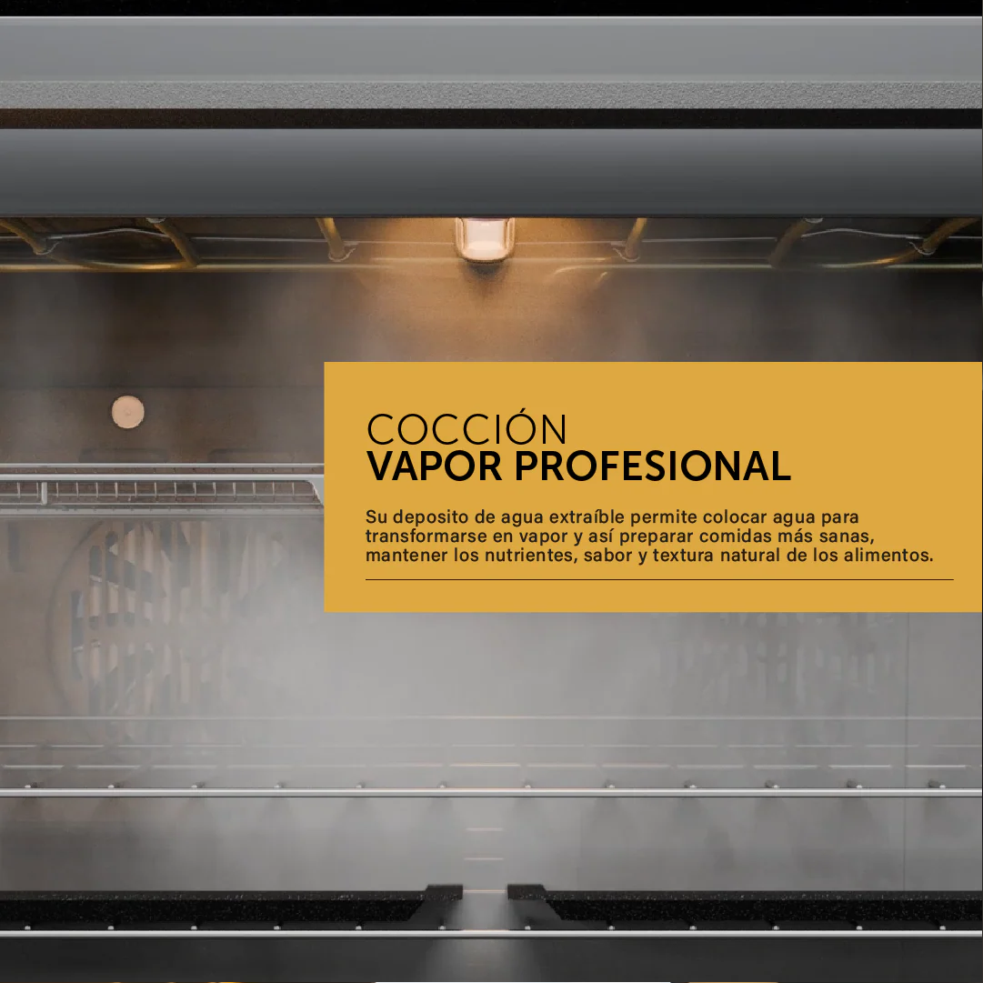 La Cocción Profesional al Vapor , con 8 Funciones específicas, garantiza platos jugosos y perfectamente cocidos, realzando el sabor natural de cada ingrediente.